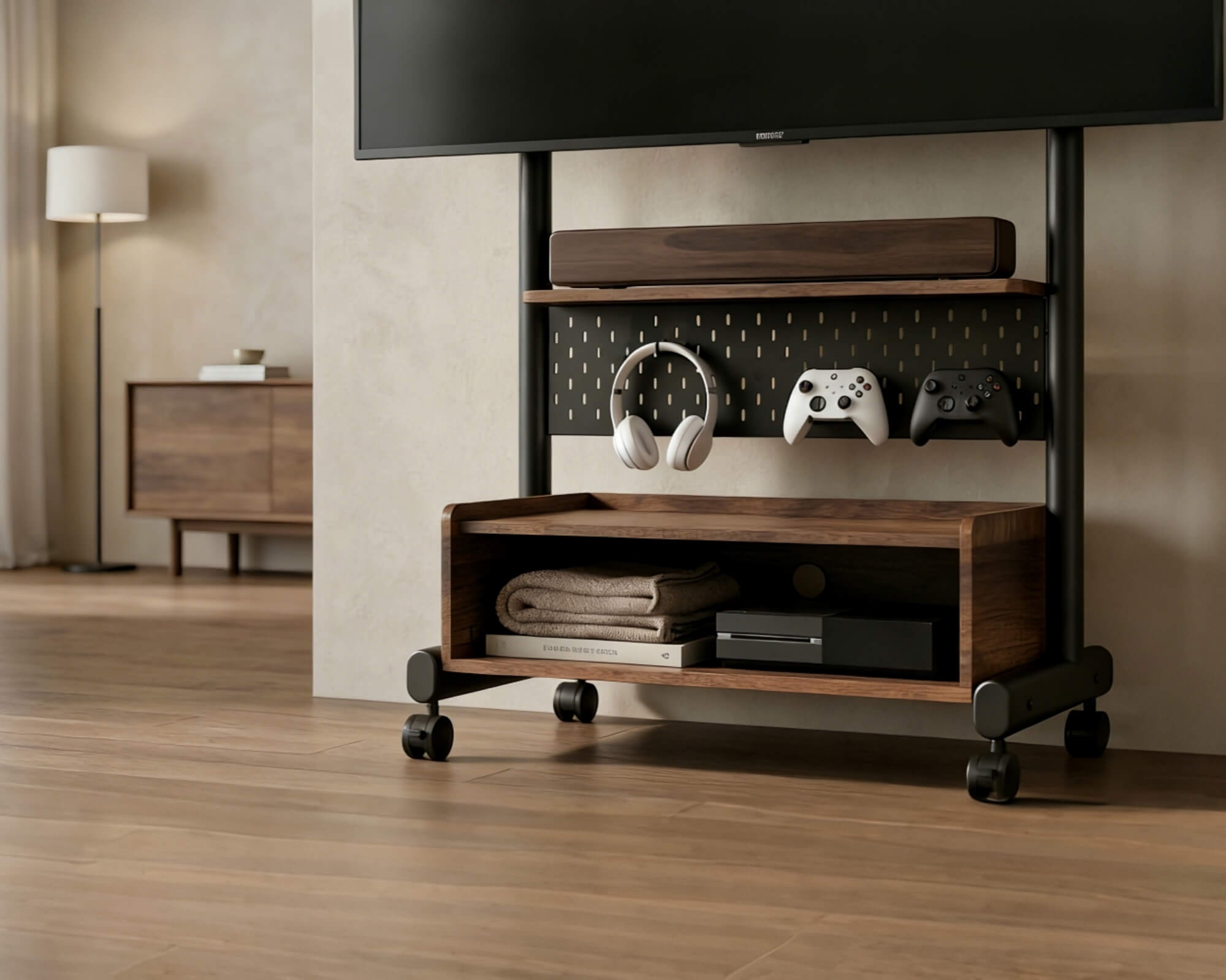 A pegboard for gaming accessories, a shelf for your soundbar, and a compartment for consoles and receivers keep your space tidy and organised. The integrated storage concept offers practical solutions for accessories such as headsets or controllers directly on the TV trolley. Everything stays within easy reach, while your setup remains clean and well-structured.