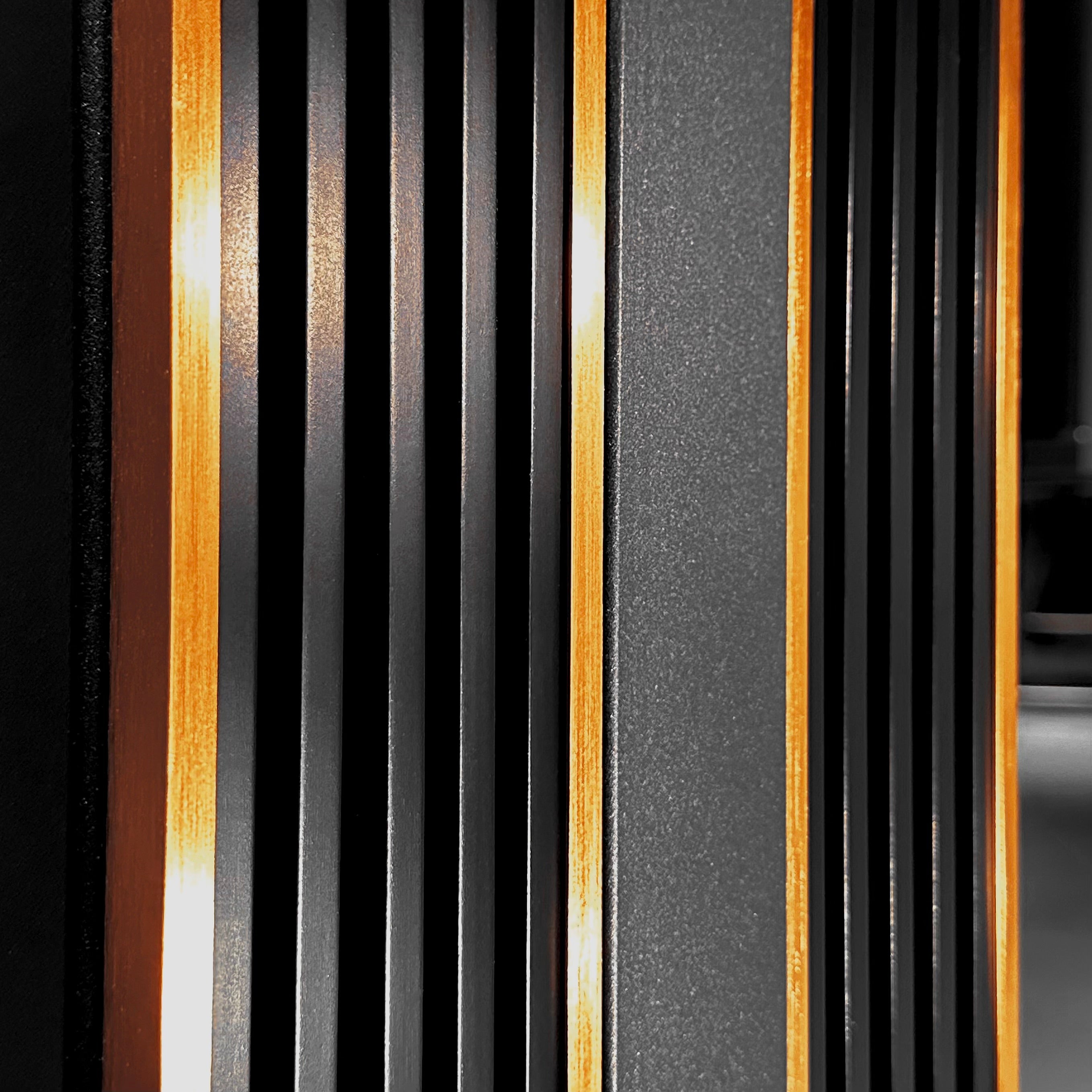 Das elegante, aufrecht stehende Massivholzgitter ist aus Kernbuche gefertigt. Das Wechselspiel von Licht und Schatten strahlt zeitlose Raffinesse aus und unterstreicht die Qualität des Möbels.