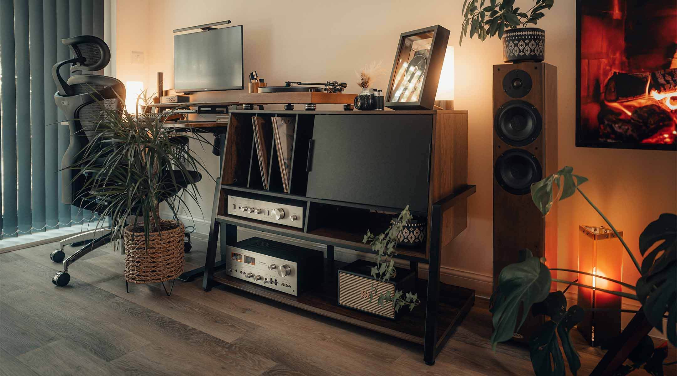 El nivel superior de este mueble HiFi está diseñado específicamente para colocar su tocadiscos. El segundo nivel cuenta con cuatro compartimentos ideales para almacenar hasta 120 discos de vinilo de 7 y 10 pulgadas. En el tercer y último nivel, los estantes abiertos ofrecen espacio adicional para otros equipos de audio y accesorios.