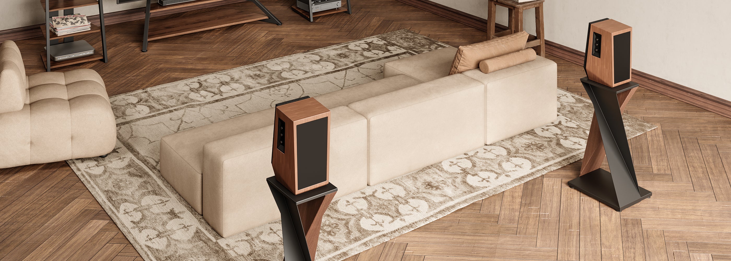 Het zachte hout neutraliseert de kou van het metaal en maakt deze elegante luidsprekerstandaard tot een hoogtepunt in uw huis.